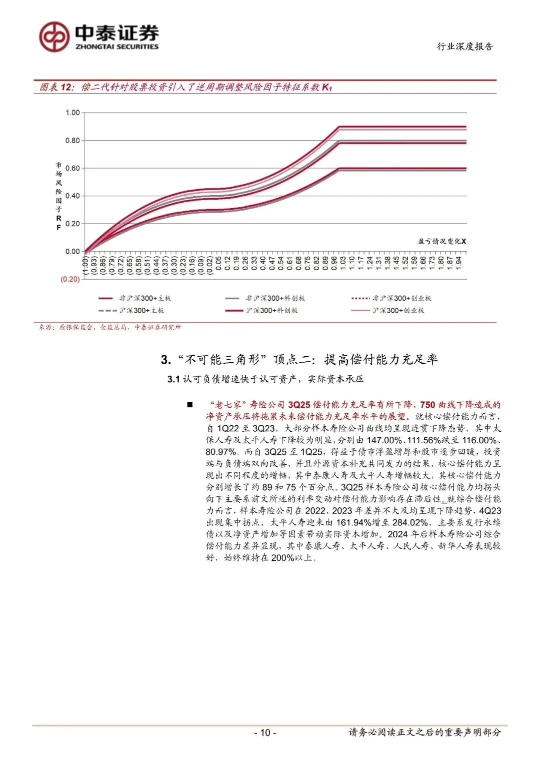 "不可能三角形"顶点二:提高偿付能力充足率。截止3Q25元末,样本寿险公司中新