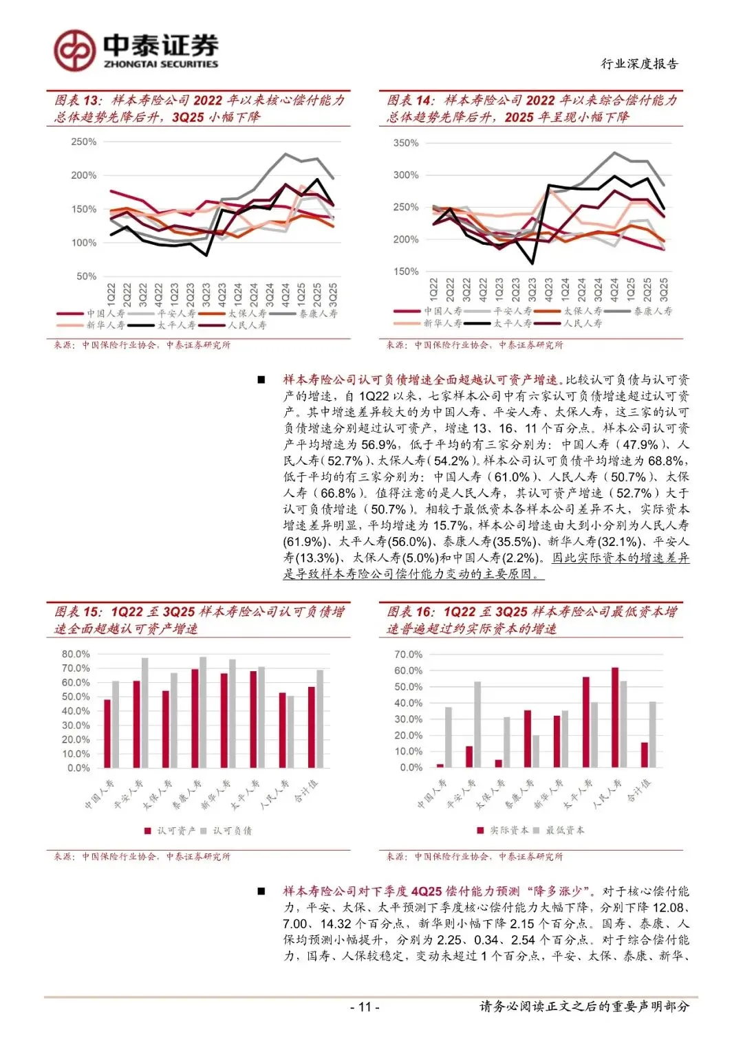 华、平安、泰康和人民人寿均不同程度通过持有至到期重分类增,厚实际资本,并完成至少一轮永续债/资本补充债发行,而太平人寿和太保人人寿未明确公告通过重分类增厚实际资本但已发行永续债,中国人寿1Q22以来尚未进行重分类且未发行永续债。3Q25同比1Q22,样本寿险公司认可负债增速(68.8%)超越认可资产增速(56.9%),实际资本的增速差异是导致样本寿险公司偿付能力变动的主要原因。3Q25样本寿险公司对下季度4Q25偿付能力预测"降多涨少"。