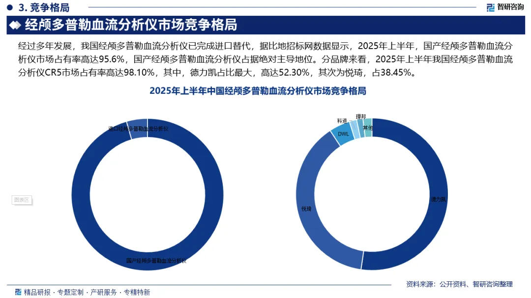 市场竞争格局:经过多年发展,我国经颅多普勒血流分析仪已完成进口替代,据比地招标网数据显示,2025年上半年,国产经颅多普勒血流分析仪市场占有率高达95.6%,国产经颅多普勒血流分析仪占据绝对主导地位。分品牌来看,2025年上半年我国经颅多普勒血流分析仪CR5市场占有率高达98.10%,其中,德力凯占比最大,高达52.30%,其次为悦琦,占38.45%。