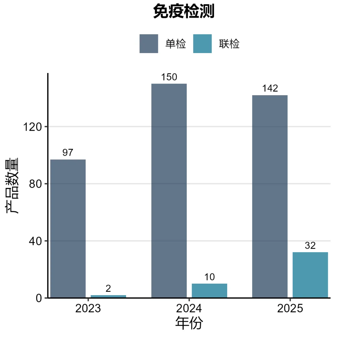 免疫检测中联检产品由2023年的2款跃升至2025年的32款。单检产品与2024年相比略下降。(图14)