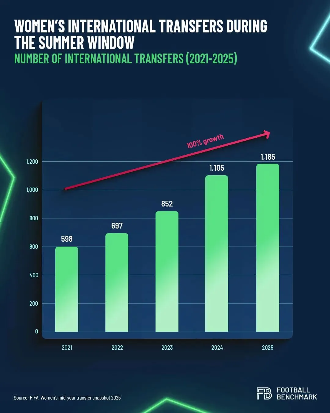 近年来,女子足球的国际(跨境)转会活动迅速增长。根据国际足联的数据,自2021年以来,夏季转会窗口完成的国际转会数量大约翻了一番,在最近一个夏季转会窗口达到了1100多笔。