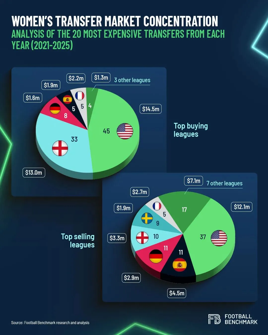 尽管交易量不断增长,付费转会活动仍然主要由少数几个联赛主导。过去五个赛季中每个赛季转会费最高的20笔交易(共计100笔交易)表明,女子足球的上游市场仍高度集中于特定地区。100名买家中,96名来自五个市场,其中NWSL和WSL的占比最高。就总转会费而言,英美俱乐部在该样本中的支出占比超过四分之三。
