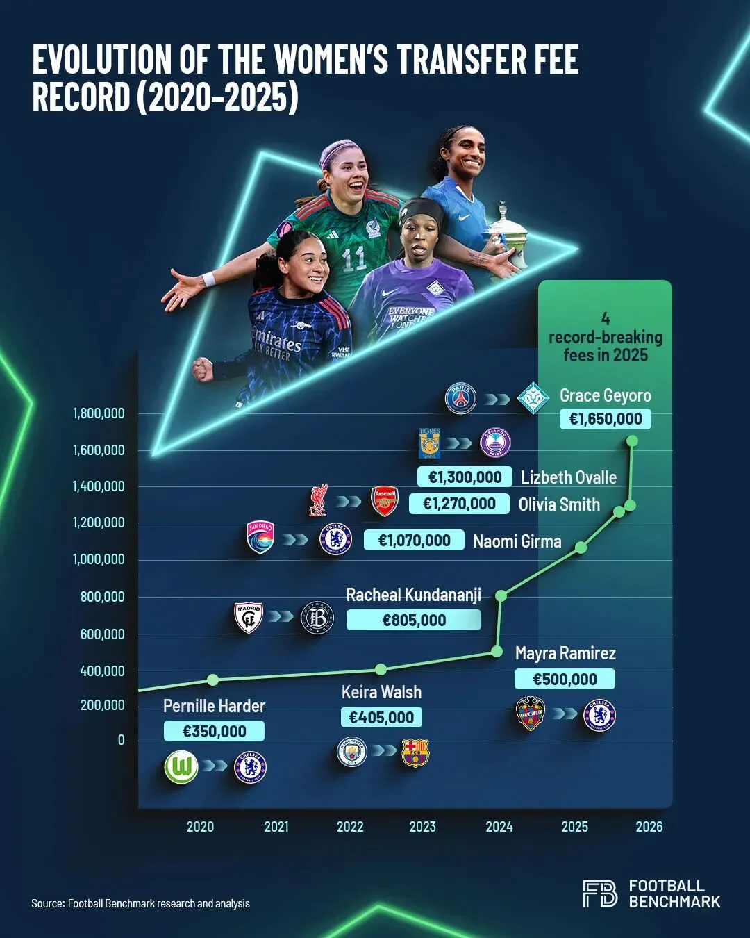 从2024年开始,变化的速度骤增,转会费纪录突破50万欧元大关,并在2025年多次刷新,Naomi Girma, Olivia Smith, Lizbeth Ovalle的转会费均达七位数。随后,Grace Geyoro 从巴黎圣日耳曼足球俱乐部转会至伦敦城雌狮,将纪录刷新至165万欧元。