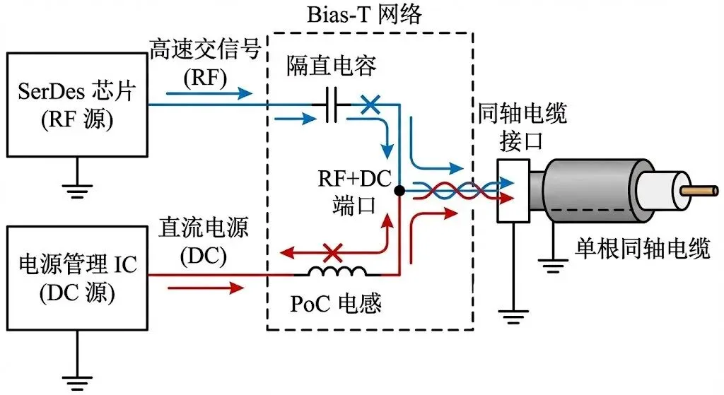 DC端口:连接电源管理IC(PMIC)或供电网络,通过一颗或多颗PoC电感阻断高频交流信号,仅允许直流电流通过 。