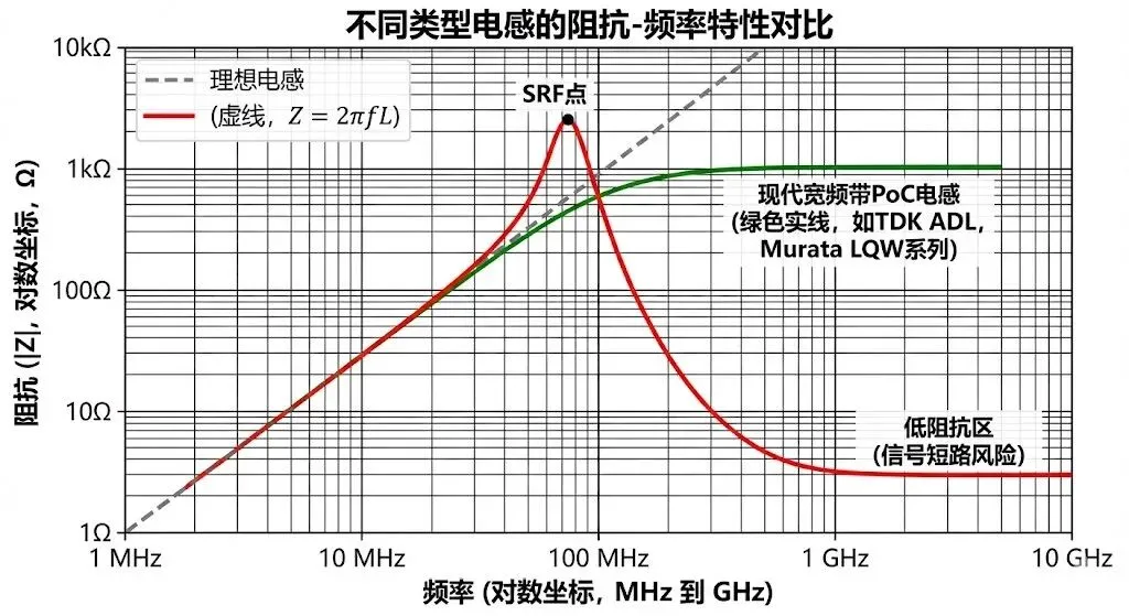 在这个架构中,PoC电感扮演着“守门员”的角色。理想状态下,它应该是一个对直流电阻为零、对交流阻抗为无穷大的元件。然而,在现实物理世界中,这几乎是不可能的任务,尤其是在宽频带应用中。