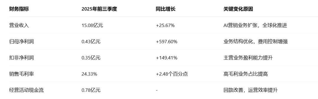 天娱数科2025年三季报呈现"收入稳健增长,利润大幅改善"的良好态势。前三季度公司实现营业收入15.08亿元,同比增长25.67%,单季度看,第三季度营业收入为5.21亿元,同比上升30.4%,增速较上半年明显加快。这一增长主要得益于AI营销业务规模扩张和全球化战略推进。
