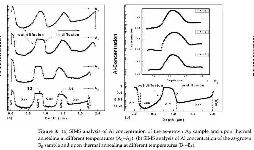 对于AlGaN样品(结构A),在未退火前,我们能看到非常漂亮的方波状浓度分布,界面陡峭。但随着温度升高,这个方波的边缘开始变塌、变宽。这说明铝原子正在跨越边界,向GaN层渗透。