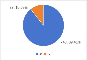 总体来看,我国现任大学校长的性别分布较不均衡。831位现任大学校长中,有743名为男性校长,约占89.41%;女性校长共有88名,约占10.59%。