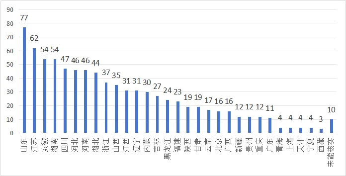 根据现有统计来看,现任大学校长的籍贯数量排前4名的省份分别是山东、江苏、安徽、湖南,占比均超过了6%;其中,山东籍校长共有77位,约占9.27%,位列第一;而青海籍、西藏籍、天津籍、宁夏籍、上海籍校长较少,排名靠后;另有10位校长的籍贯未能核实。从地区分布来看,籍贯属于华东、华南、华中、华北、西北、西南、东北地区的校长数量分别为288、27、144、131、58、91、82位。