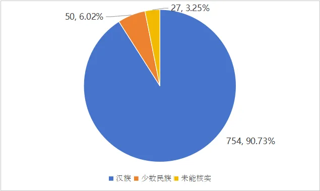 根据我国大学校长民族分布比例(图4)和少数民族分布(图5)可知,我国大学校长是一个以汉族为主的群体,汉族校长的总量为754人,占比90.73%;少数民族校长为50人,占比6.02%;相关信息未能核实的校长为27人,占比3.25%。其中,50位少数民族校长中,回族、满族、维吾尔族、土家族、壮族的校长人数均在5位及以上。