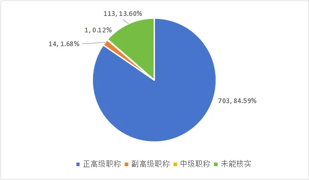 如图9所示,现任大学校长中,具有正高级职称的校长为703人,占比达84.59%,包括教授、研究员、教授级高级工程师;具有副高级职称的校长为14人,占比为1.68%,包括副教授、副研究员、高级工程师;具有中级职称的校长仅有1人,占比为0.12%;职称信息未能核实的校长有113人,占比13.60%。