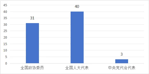 参与国家政治活动是指校长在任期间参与中国共产党全国代表大会、中国人民政治协商会议和全国人民代表大会的情况,具体包括2017年中国共产党第十九次全国代表大会、2018年十三届全国人大会议、2018年中国人民政治协商会议第十三届全国委员会第一次会议、2022年中国共产党第二十次全国代表大会、2023年十四届全国人大一次会议、2024年中国共产党第二十届中央委员会第三次全体会议等全国重大会议。如图10所示,所有在任校长中,参与全国人大会议和全国政协会议的人数居多,分别为40位和31位;参加中央党代会的代表为3位。