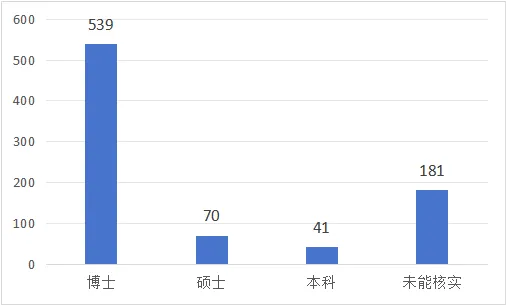 受教育程度(获得的学位)是研究大学校长最常见的观测维度。据公开数据显示,我国大学校长属于高学历群体。图12说明,在831位大学校长中,最高学位为博士的校长有539人,占比64.86%;最高学位为硕士的校长有70人,占比8.42%;最高学位为本科的校长人数较少,为41人,占比4.93%;学历信息未能核实的校长有181人,占比21.78%。