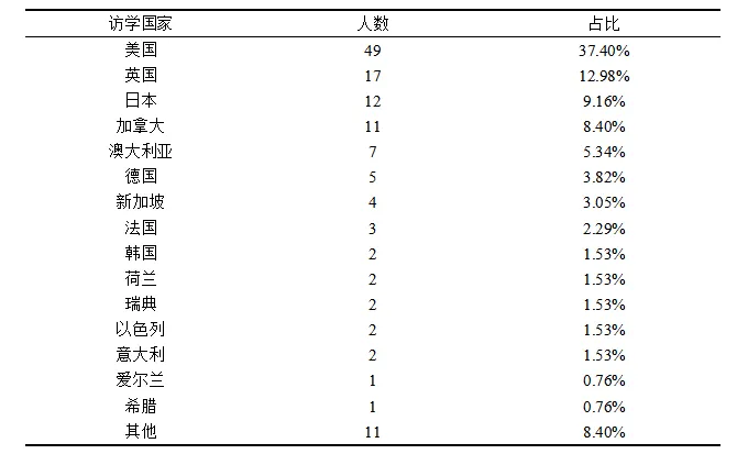 表 2 有海外境外访学经历校长访学国家的数量与比例