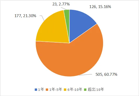 数据显示,现任大学校长的平均任期年限为4.62年。其中,由于2023年-2024年新上任的校长较多,所以任职年限在1年内的大学校长有126位,占比达 15.16%;有505位校长的任职年限在1年至5年,占比60.77%;有177位校长的任职年限在6年至10年,占比21.30%;而任职年限超过10年的校长,有23位,占比2.77%。