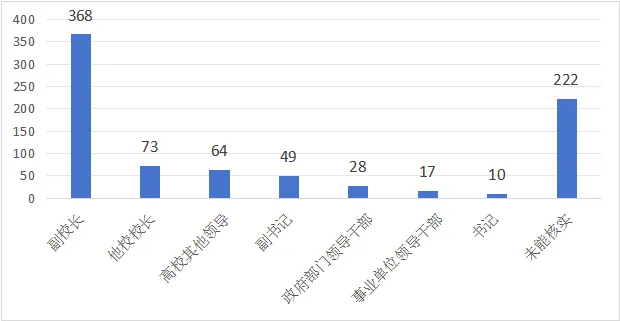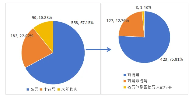 其中,在558位是硕士生导师的校长中,有423位校长同时是博士生导师,占比75.81%;有127位校长仅是硕士生导师而非博士生导师,占比22.76%;是硕导但是否为博导到的相关信息未能核实的大学校长有8位,占比1.43%。