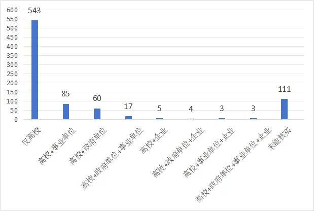 由图17可知,831位大学校长中,有543位校长仅在高校有履职经历,占比高达65.34%,可以看出我国多数校长将一生都奉献给了教育事业。有85位校长有在高校和事业单位任职的经历,占比10.23%;在高校和政府单位有过工作经历的有60位,占比7.22%;在政府单位、事业单位、高校任职过的大学校长有17位,占比2.05% ;在企业与高校任职过的校长有5位,占比0.60%;在政府单位、企业、高校都任职过的校长有3位,占比0.36%;在事业单位、企业和高校任职过的校长有4位,占0.48%;另有3位校长在所有统计类型的单位中均有任职,占比0.36%。此外,有111位大学校长的工作经历未能核实相关信息,占比13.36%。