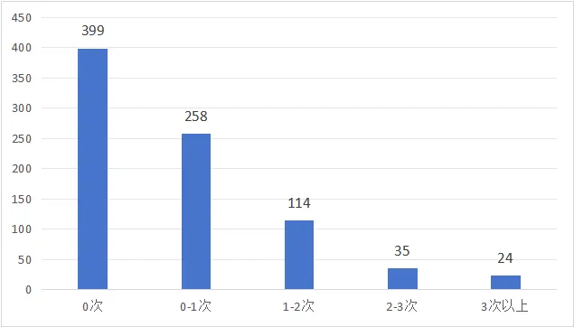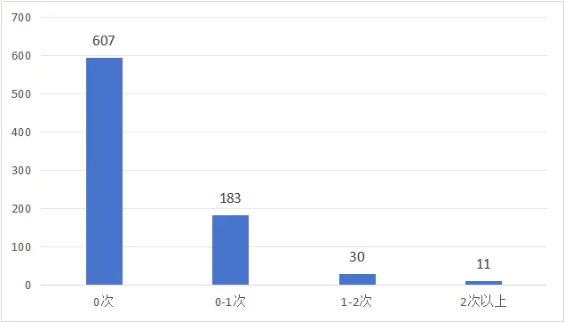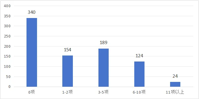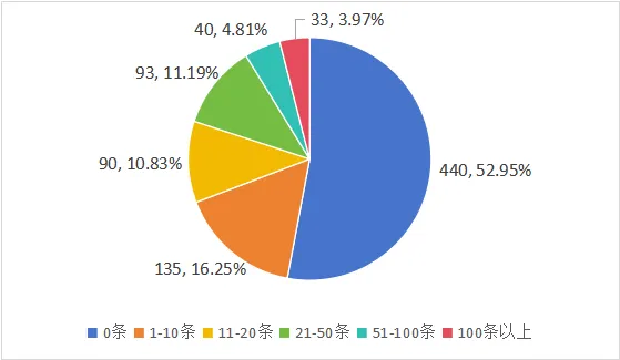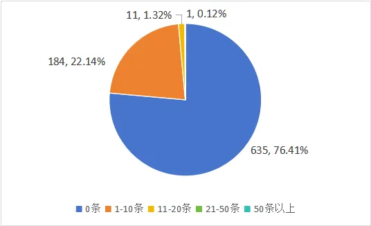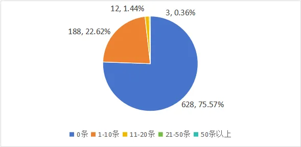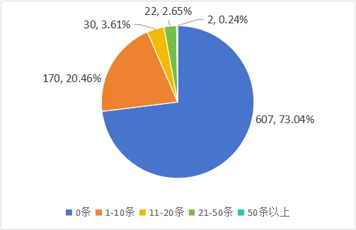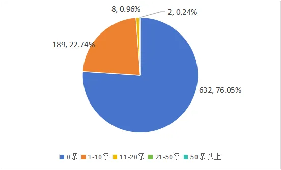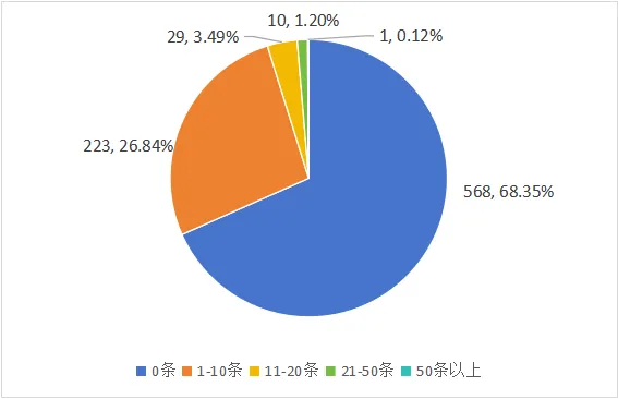 安全稳定与后勤保障类是指与学校安全稳定和后勤保障的工作,主要关键词包括“安全”“后勤”“食堂”以及“环境”等。如图27所示,有568位大学校长在任期间在安全稳定与后勤保障方面未发布相关新闻动态,占比最大,为68.35%;有223位大学校长发布了1-10条关于此方面的新闻动态,占比26.84%;有29位大学校长在任期间新闻动态数量在11-20条之间,占比3.49%;有10位校长在任期间新闻动态数量均在21-50条之间,占比1.20%;发布此类新闻动态50条以上的有1位校长,占比0.12%。根据统计,831位校长年均安全稳定与后勤保障类新闻动态数最大值为7条,平均值为1.88条。