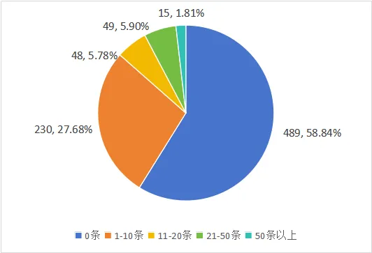 思政教育与学生事务类是指组织开展思想品德教育的与学生的奖励或处分、招生和就业工作相关的活动,主要关键词包括“思想政治”“主题教育”“红色文化”以及“心理健康”等。图24显示,在思政教育与学生事务类新闻动态中,有489位校长没有此类动态,占比58.84%;有230位大学校长在任期间此类新闻动态数处于1-10条之间,占比27.68%;有48位大学校长在任期间此类新闻数处在11-20条之间,占比5.78%;处在21-50条之间的校长有49位,占比5.90%;在任期间此类新闻动态数量处在51条以上的校长有15位,占比1.81%。根据统计,831位校长年均人才培养与学术事务类新闻数最大值为18.63条,平均值为5.18条。