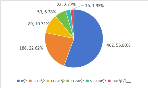 根据公开信息的查询结果发现,如图37所示,在任期间未做过学术报告的校长607人(其中有14位校长有做过学术报告,但任职一年以下,也归入此类),占比73.04%;在任期间年均做过不到1次学术报告的校长有183人,占比22.02%;在任期间年均做过1-2次学术报告的校长有30人,占比3.61%;在任职期间年均做过大于2次以上学术报告的校长有11个,占比1.32%。所有校长中,平均每位校长在任期间年均做过2.37次学术报告,年均排名第一的校长年均做了13次学术报告。