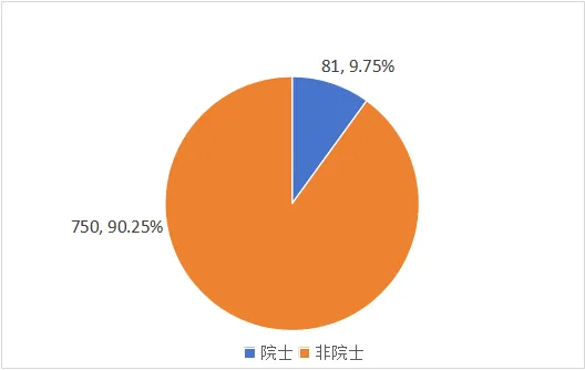 两院院士作为我国国家科学技术领域的最高学术荣誉,校长获得这一荣誉的比例是比较少的。图29数据显示,831位大学校长中,有 81 位校长是两院院士,占比 9.75%;其余校长不是两院院士,占比90.25%。