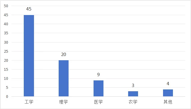 图31说明,在81位院士校长中,有45位院士校长的学科属于工学,占比 55.56%;学科所属为理学的院士校长次之,有20位,占比 24.69%;学科所属为医学的院士校长有9位,占比 11.11%;学科所属为农学和其他学科的院士校长分别有3位和4位。