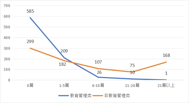 在教育管理类论文方面,校长发表教育管理类论文随着篇幅的增加而减少,发表1-5篇论文的校长数为209人,占比25.15%;发表6-10篇论文的校长数为26人,占比3.13%;发表11-20篇论文的校长数为10人,占比1.20%;发表21篇以上论文的校长数量为1人。在非教育管理类论文方面,发表1-5篇论文的校长数为182人,占比21.90%;发表6-10篇论文的校长数为107人,占比12.88%;发表11-20篇论文的校长数为75人,占比9.03%;发表21篇以上论文的校长数为168人,占比20.22%;对校长在任期间发表论文数年均数统计的结果显示,在教育管理类论文方面(排除学科归属为教育学类的校长),年均发表数量最多为8篇。在非教育管理类论文方面,年均发表数量最多为63篇。