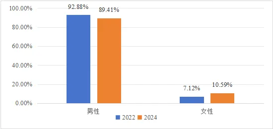 如图42所示,与2022年相比,近两年来中国大学校长的性别结构有所优化,女性校长占比由7.12%上升至10.59%。