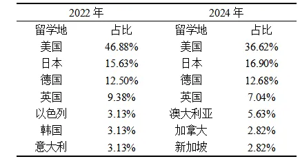 表3 2022年和2024年有海外境外留学经历校长的主要留学地分布情况