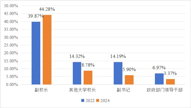 如图47所示,根据获得的公开数据显示,与2022年相比,我国更加注重大学校长的行政管理水平,更倾向于从副校长这一分管学校业务工作的岗位中提拔校长人选,其占比由2022年的39.87%升至2024年的44.28%。而从其他大学调任校长或从大学副书记、政府部门领导干部中提拔校长的比重则下降较为明显。