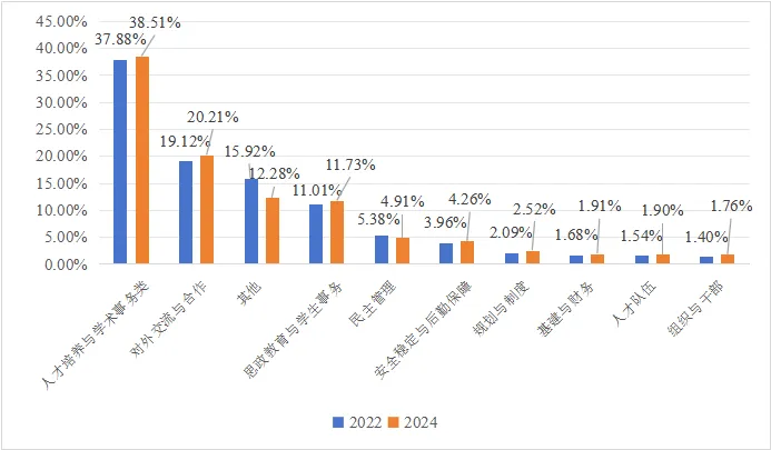 由图48可知,根据获得的公开数据显示,与2022年相比,中国大学校长履职重点保持不变,除“民主管理”和“其他”外,占比均有所上升;“对外交流与合作”上升幅度最大,约为1.09个百分点,表明中国大学校长愈发重视高校的对外开放程度。