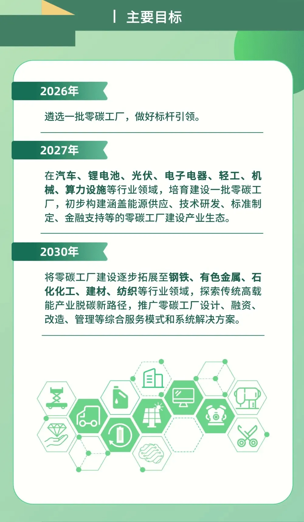 2026年起 | 遴选标杆零碳工厂,发挥示范引领作用 | 脱碳需求迫切、能源消费以电力为主、脱碳难度较小的行业 | 探索零碳工厂规划设计、能源供应、工艺技术等核心模式 |