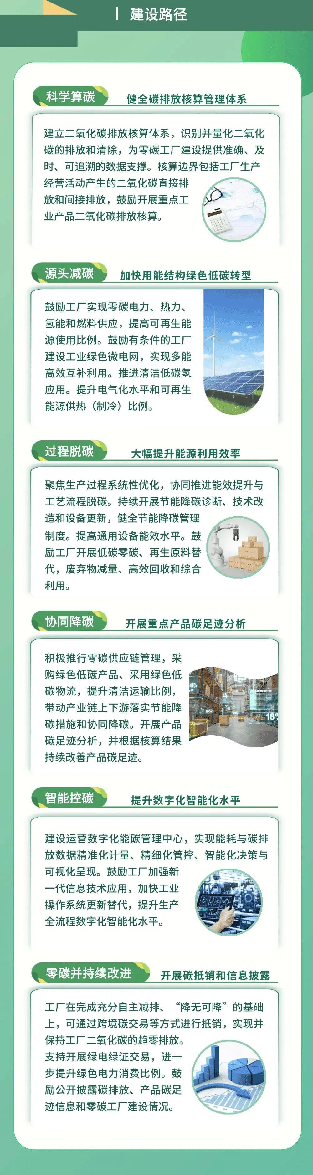 《指导意见》明确六大建设路径,形成“算碳-减碳-控碳-持续改进”的全流程闭环管理体系,各路径相互支撑、协同发力: