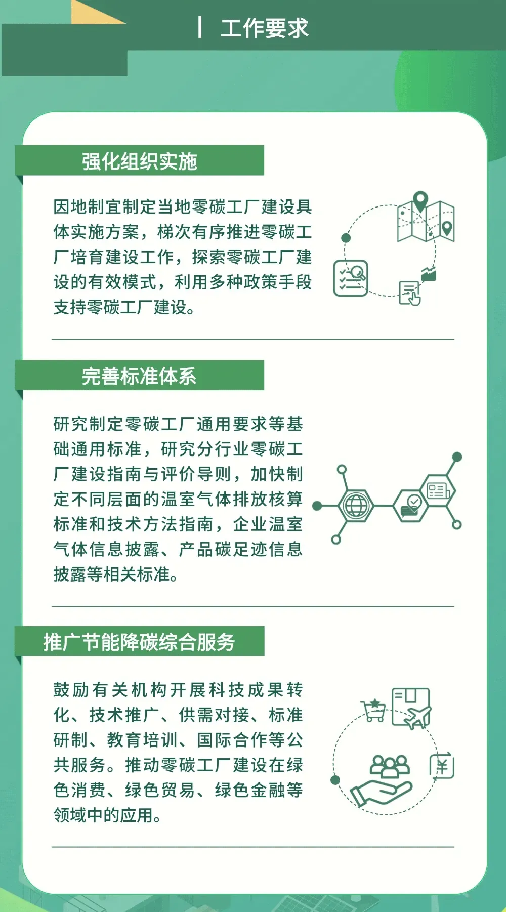 为确保《指导意见》有效实施,明确三大工作要求:一是强化组织实施,地方相关部门结合实际制定具体实施方案,多主体协同解决实施难题,强化政策支持;二是完善标准体系,研究制定零碳工厂通用标准、分行业建设指南与评价导则,加快碳排放核算、信息披露等标准制定,加强与国际标准衔接;三是推广节能降碳综合服务,鼓励行业协会、科研院所等提供技术推广、供需对接、人才培训等服务,健全市场化机制。