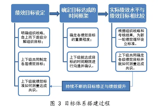 目标体系确保了全员工作的“战略导向制”,其将企业战略展望与业务使命转换成明确、具体的业绩目标,采取自上而下的分解法,将战略、运营流程、各职能部门、员工等和谐统筹,使各部门、各岗位的执行行为与企业战略、文化有效契合,平衡各种利益关系,形成协同效应,目标体系搭建过程如图3所示。