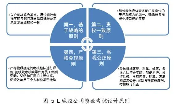 L城投公司本部绩效方案的设计以图5所示的四项原则为基准,结合不同层级、岗位的职责分工、任务分配从而确定考核的关键指标。根据L城投的绩效考核体系,其绩效方案可分为高层管理者、中层管理者、基层员工三个层面来设计。