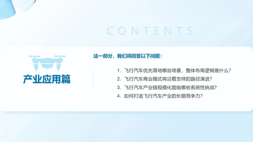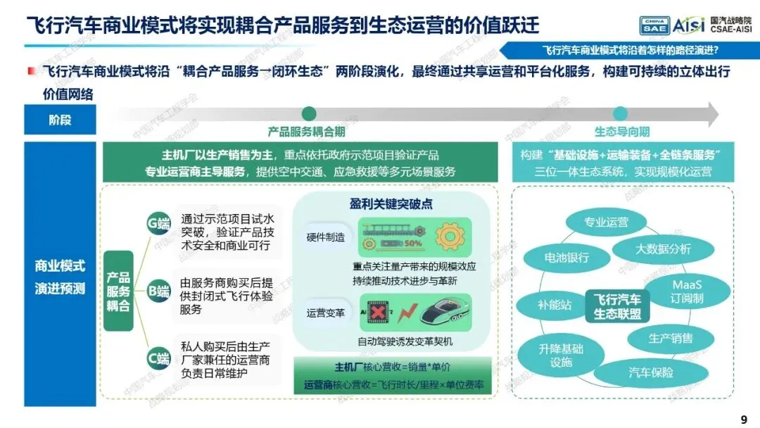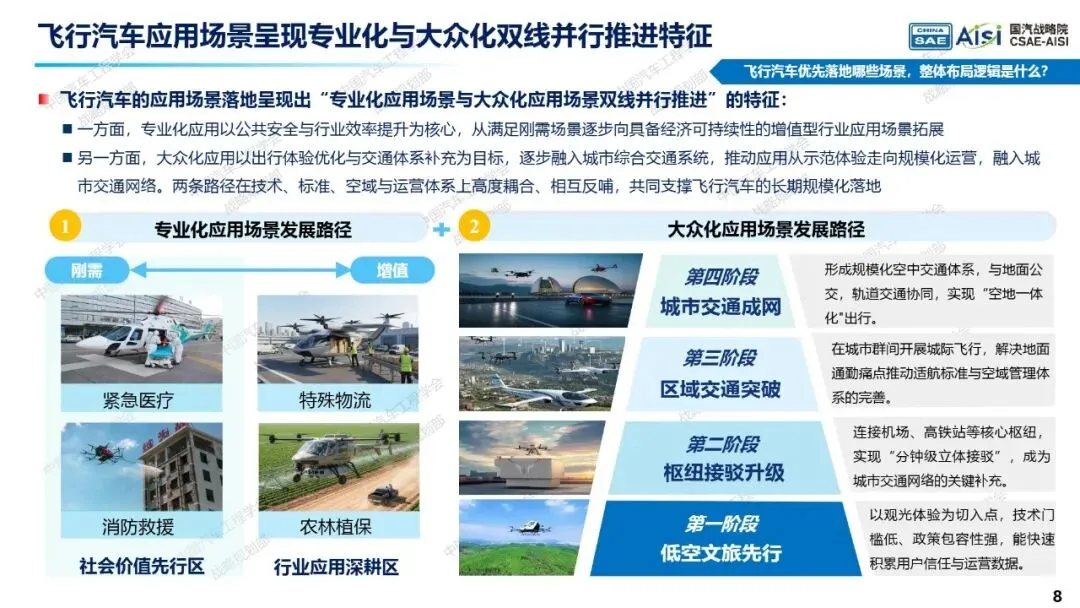 该报告预测,飞行汽车预计在2025至2030年间迎来商用爆发。在应用场景方面,将呈现专业化与大众化双线并行的推进特征。专业化场景将率先在应急救援、警务升级及公路巡检等领域实现突破。大众化场景将遵循“低空文旅先行、枢纽接驳跟进、城市通勤后续”的渐进式发展路径。亿航智能等企业的文旅飞行项目已在多地落地,而机场与市区间的短途接驳、以及城市群之间的城际交通,预计将成为下一阶段规模化应用的重点。