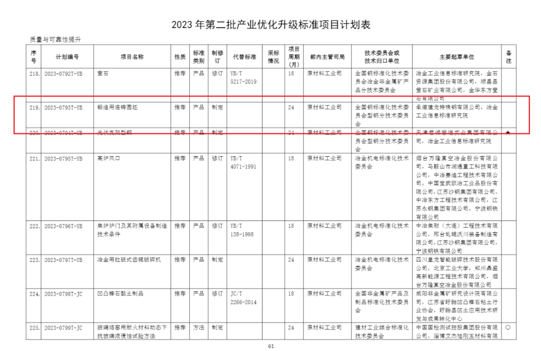 承德建龙经过充分论证和准备后,于2022年下半年向全国钢标委型钢分技术委员会提出《锻造用连铸圆坯》的标准立项申请。凭借产品优势以及在锻造圆坯领域强大的技术实力,经过多层级考核答辩,最终获批立项。