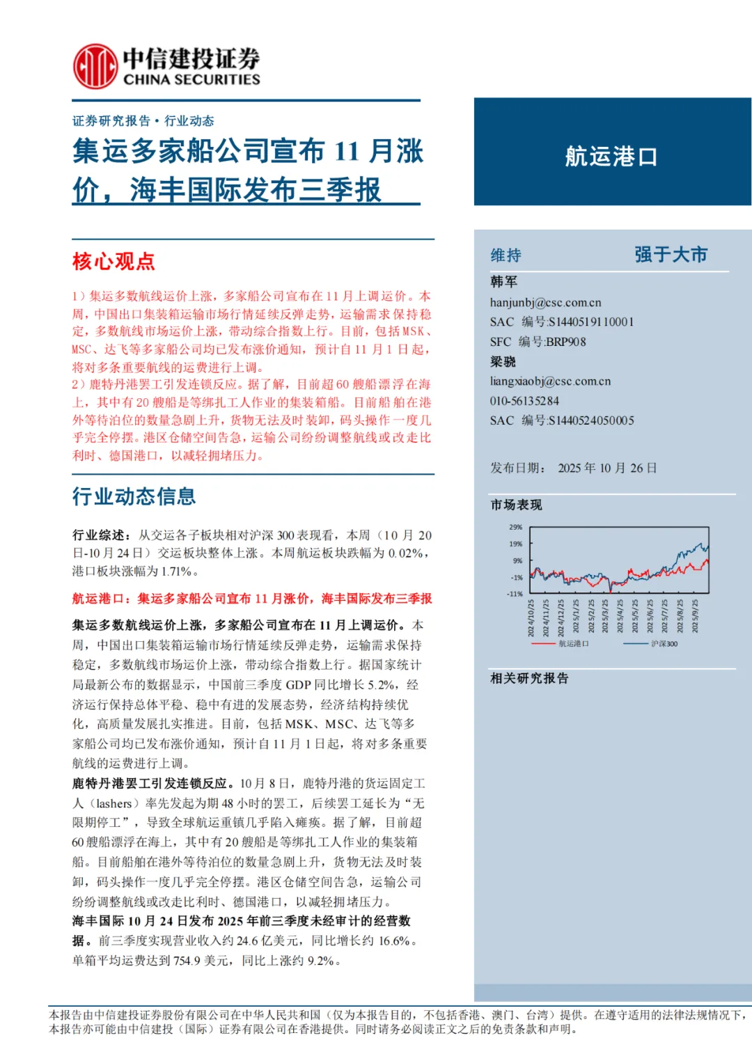 下载报告:航运港口行业动态:集运多家船公司宣布11月涨价,海丰国际发布三季报