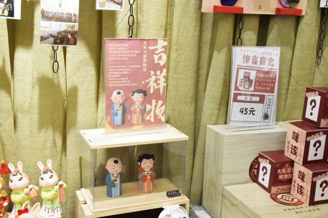 进入馆内,映入眼帘的是一个又一个摆满了大吴泥塑文创产品的展架,展架上的文创产品种类繁多,有大吴泥塑体验套装、大吴泥塑文化明信片、土叽咕泥塑口哨等,都体现了传统与现代元素的结合。