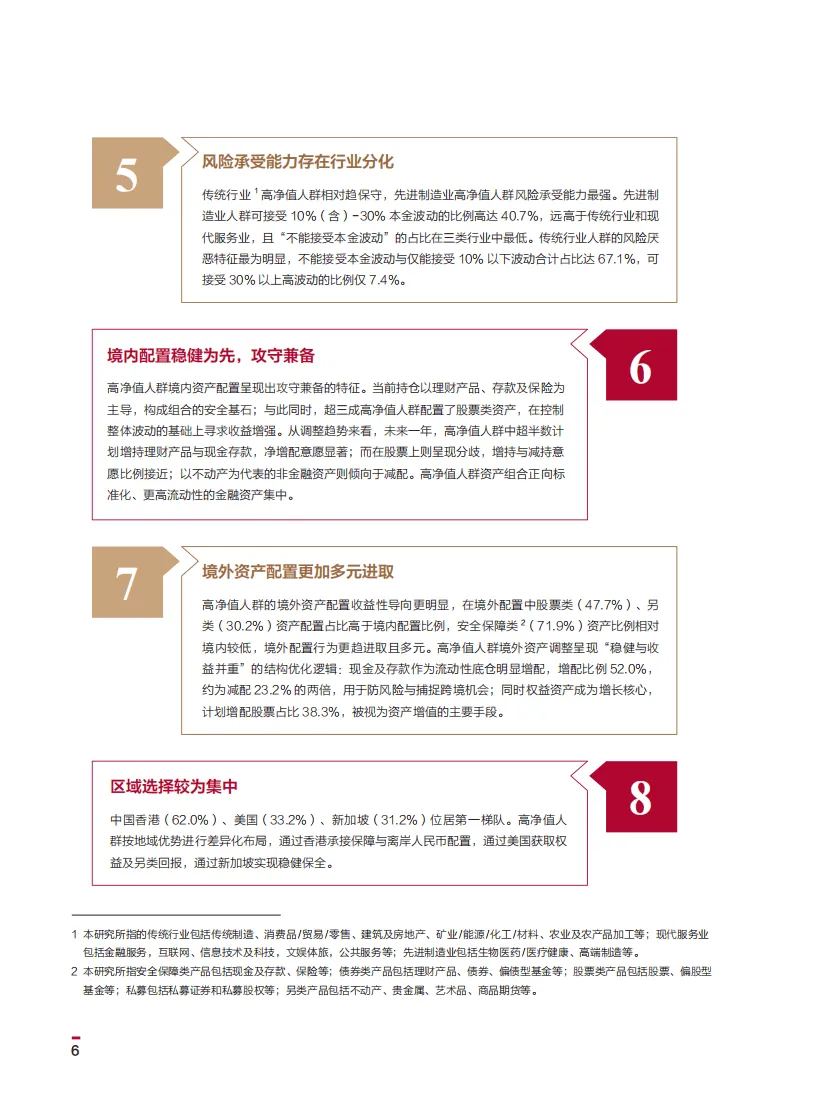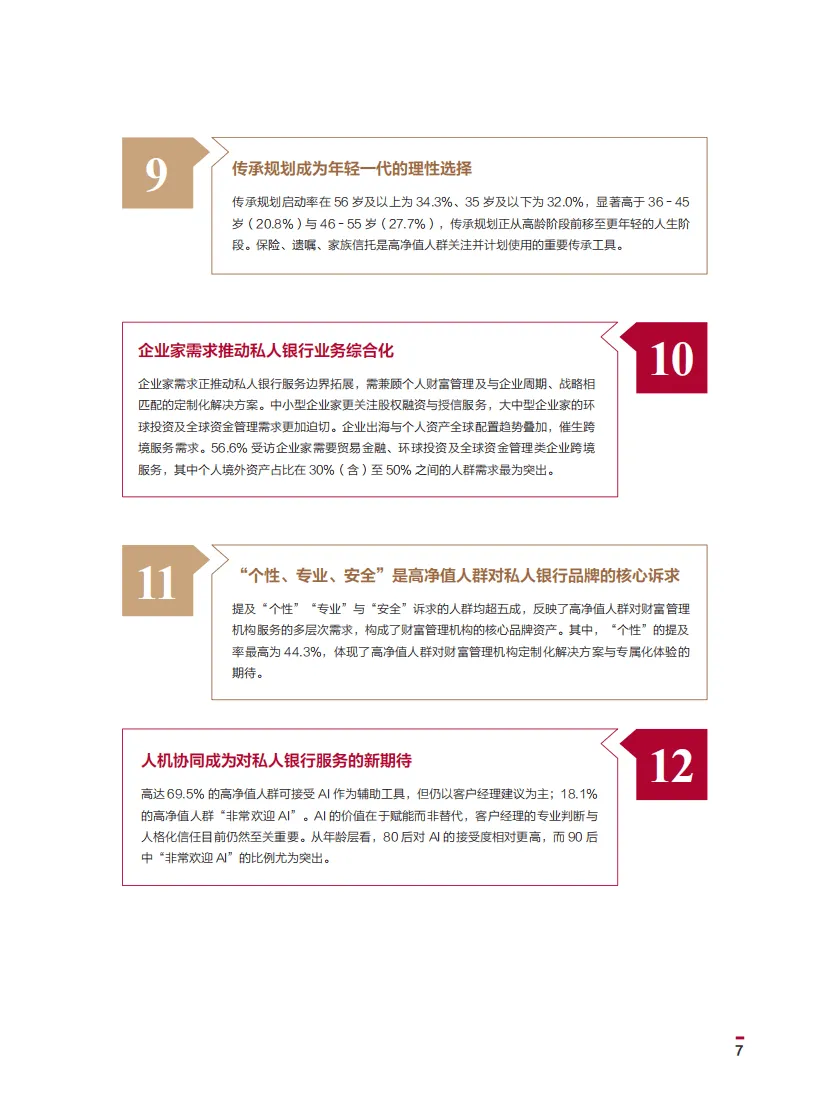 2026年中国高净值人群财富管理呈现多元特征,人群涵盖传统行业、现代服务业及先进制造业从业者,企业家为核心群体,代际差异显著——70后、80后风险承受力最强,60后及以前关注信息对称,90后偏好数字化服务。资产配置以稳健为主,境内侧重理财、存款、保险等安全保障及债券类资产,境外更趋进取,股票与另类资产占比更高,中国香港、美国、新加坡为主要配置区域,配置动机包括子女境外教育、投资机会捕捉等。服务需求向综合化延伸,医疗健康、子女教育、法税咨询成新刚需,传承规划提前且工具以保险、遗嘱、家族信托为主,企业家群体对家企联动、跨境金融服务需求突出。高净值人群首选银行类机构,多银行合作成常态,对财富管理机构的核心诉求为个性、专业、安全,人机协同成为服务新期待。