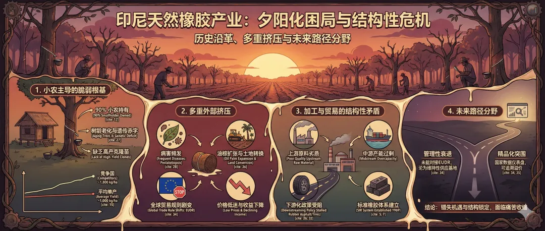 印尼橡胶产业的故事是一个关于错失机遇与结构锁定的警示录。它拥有最优越的自然条件,却因长期忽视农业技术改良(翻种、克隆)和基础设施建设,导致在与泰国的竞争中落败。当前,在病害、低价和油棕扩张的夹击下,该产业正在经历痛苦的收缩。