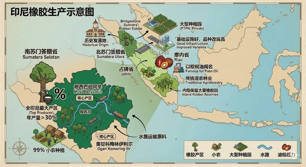 • 南苏门答腊省(Sumatera Selatan): 这是印尼最大的橡胶生产省份,年产量通常占全国的30%以上 14。这里的种植结构具有极高的小农比例(接近99%)15。穆西巴纽阿辛(Musi Banyuasin)和奥甘科梅林伊利尔(Ogan Komering Ilir)是核心产区。这里的橡胶树多沿穆西河及其支流分布,便于通过水路运输原料。 • 北苏门答腊省(Sumatera Utara): 作为历史发源地,这里保留了较多的国有(PTPN)和私营大型种植园(如Bridgestone Sumatra Rubber Estate)。相比南部,北部的基础设施更好,品种改良程度也相对较高,但面临着激烈的城市化和油棕扩张压力。 • 占碑省(Jambi)与廖内省(Riau): 这两个省份是连接南北苏门答腊的枢纽。占碑省的橡胶小农多采用传统的混农林业,而廖内省虽然以棕榈油闻名,但其内陆地区仍保留了大量橡胶园 13。