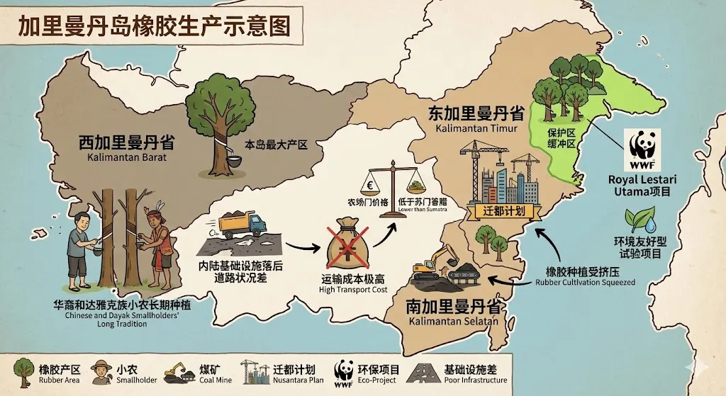 • 西加里曼丹省(Kalimantan Barat): 是该岛最大的产区。由于历史原因,这里的华裔和达雅克族小农有长期的种植传统。然而,由于内陆基础设施落后(道路状况差),原料运输成本极高,导致胶农获得的“农场门价格”(Farm-gate price)往往低于苏门答腊 14。 • 南加里曼丹与东加里曼丹: 这里的橡胶种植近年来受到煤矿开采和迁都计划(Nusantara)的挤压。东加里曼丹目前正在试验一些“环境友好型”橡胶项目,如与WWF合作的Royal Lestari Utama项目,旨在在保护区缓冲区种植橡胶 16。