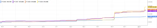 请看下方图表,展示了未来几年的营收一致预期(consensus revenue forecast):