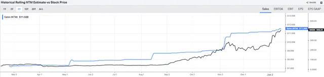 那为何这对股价是利好?请看下面这张叠加了未来12个月营收预期与股价的图: