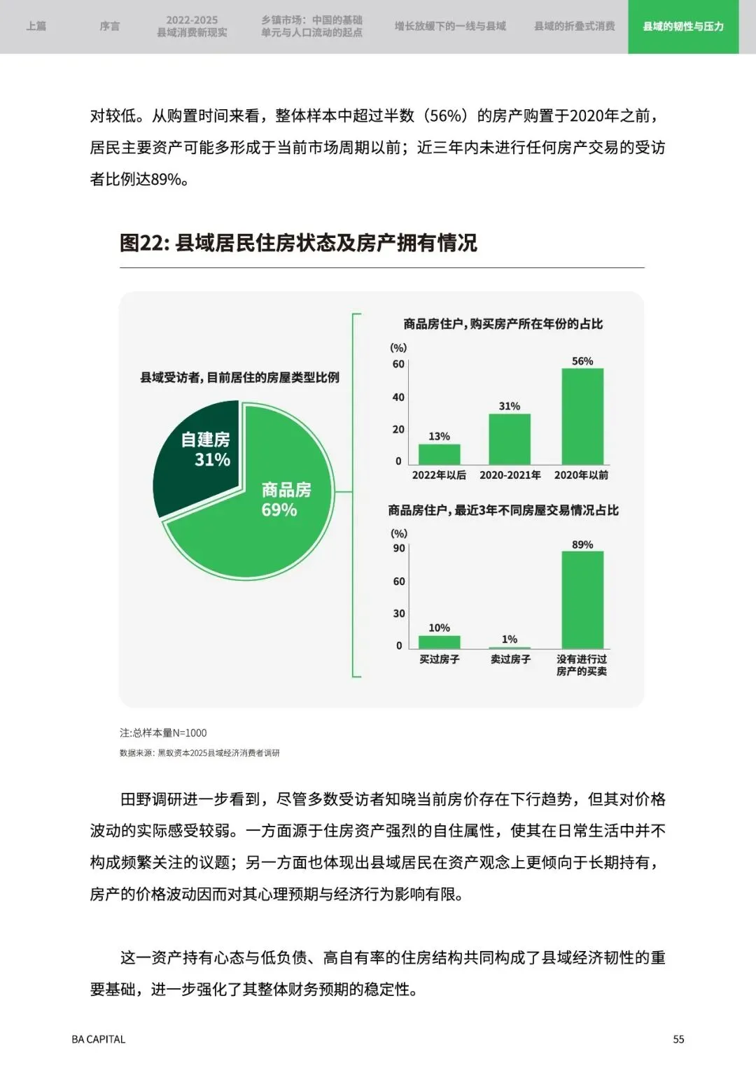 “零负债”房产护城河。报告显示县域住房自有率超80%,其中56%房产购于2020年前,且近九成居民近三年未购房。这意味着多数人躲过了房价波动冲击,更妙的是——54%的县城人住在自建房或父母房,压根没有房贷压力!对比一线城市动辄数百万的房贷月供,县城人自然敢花钱。