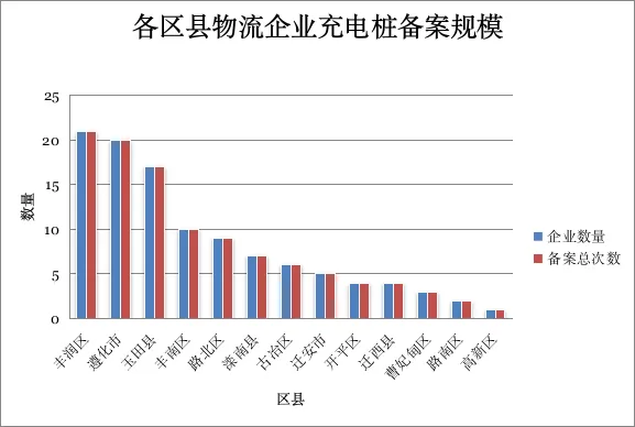 备案规模区域差异显著,布局与各区域物流场景需求高度适配:丰润区、遵化市、玉田县为备案核心区域,合计备案量占比超半数,凸显县域及城乡结合部综合物流、城乡配送的充电补位需求;丰南、迁安聚焦钢铁物流场景,专用桩布局集中;曹妃甸区贴合港口物流需求,精准配置专用充电资源。其余区域备案量相对较少,整体呈现“核心区域集聚、特色场景精准适配”的分布特点(具体数据详见表格及图表)。