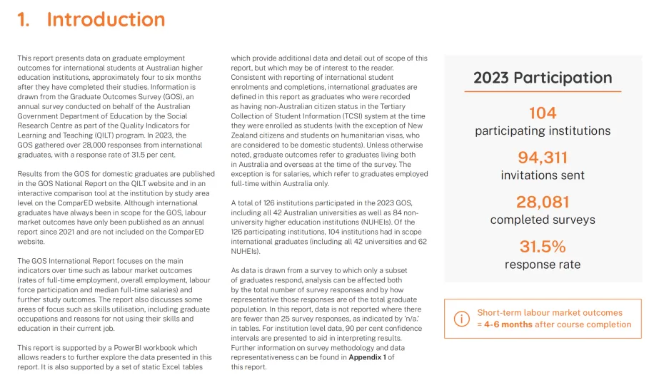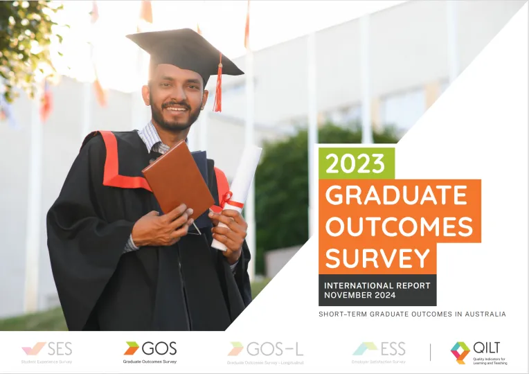 学习与教学质量指标(QILT)作为澳大利亚政府认可的高等教育调查体系,通过《毕业生就业调查(GOS)》追踪留学生毕业后 4-6 个月的就业状态。2023 年,GOS 共收集来自 104 所澳洲机构(含澳洲大学)的 28,081 份国际毕业生问卷,响应率达 31.5%,数据覆盖本科、授课型研究生及研究型研究生三个层次,为就业分析提供了可靠依据。