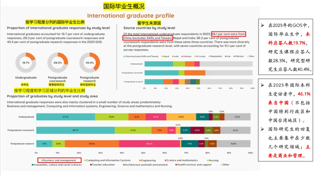2023 年国际本科生受访者中,46.1% 来自中国(不含中国港澳台)、尼泊尔和印度;授课型研究生中,这三个国家的毕业生占比更高达 56.2%;研究型研究生来源则更分散,前七国合计占比 51.1%。